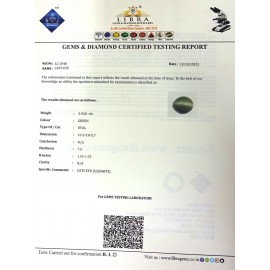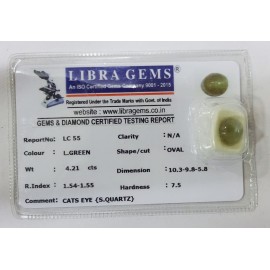 REPORT NO . LC 55CLARITY . N/ACOLOUR . L . GREENSHAPE / CUT . ROUNDWT . 4.21 CTSDIMENSION . 10-3.9-8.5-8.R . INDEX . 1.54-1.55HARDNESS . 7.5COMMENT . CATS EYE { S . SQUARTZ }..