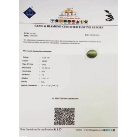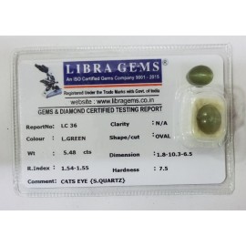 REPORT NO . LC 36CLARITY . N/ACOLOUR . L . GREENSHAPE / CUT . OVALWT . 5.48 CTSDIMENSION . 1-8.10-3.6-5.R . INDEX . 1.54-1.55HARDNESS . 7.5COMMENT . CATS EYE { S . QUARTZ }..
