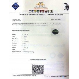 REPORT.NO.-LC 392CLARITY.-N/ACOLOUR.-GREENSHAPE/CUT.-OVALWT.-7.68 CTSDIMENSION.-3-3.1-3.7-4.R.INDEX.-1.54-1.55HARDNESS.-7.5COMMENT.-CATS EYE { S . QUARTZ }..