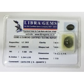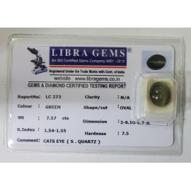 REPORT NO . LC 273CLARITY . N/ACOLOUR . GREENSHAPE / CUT . OVALWT . 7.57 CTSDIMENSION . 2-6.10-6.7-8.R . INDEX . 1.54-1.55HARDNESS . 7.5COMMENT . CATS EYE { S . QUARTZ }..