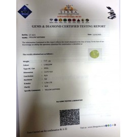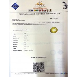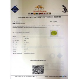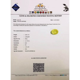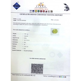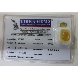 REPORT NO . LY 107CLARITY . N/ACOLOUR . YELLOWSHAPE / CUT . OVALWT . 3.84 CTSDIMENSION . 9-9.8-2.4-3.R . INDEX . 1.76-1.78HARDNESS . 9.0COMMENT . YELLOW SAPPHIRE..