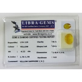 REPORT.NO.-LYA 119CLARITY.-N/ACOLOUR.-YELLOWSHAPE/CUT.-OVALWT.-4.12 CTSDIMENSION.-1-8.9-7.3-6.R.INDEX.-1.76-1.78HARDNESS.-9.0COMMENT.-YELLOW SAPPHIRE { A }..