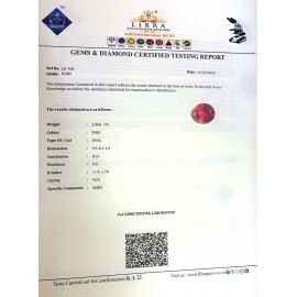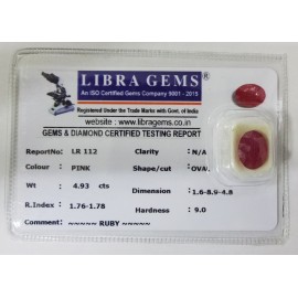 REPORT NO . LR 112CLARITY . N/ACOLOUR . PINKSHAPE / CUT . OVALWT . 4.93 CTSDIMENSION . 1-6.8-9.4-8.R . INDEX . 1.76-1.78HARDNESS . 90COMMENT . RUBY..
