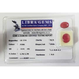 REPORT.NO.-LR 374CLARITY.-N/ACOLOUR.-PINKSHAPE/CUT.-OVALWT.-4.01 CTSDIMENSION.-1.1-8.8-4.2R.INDEX.-1.76-1.78HARDNESS.-9.0COMMENT.-RUBY..