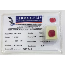 REPORT.NO.-LRA 105CLARITY.-N/ACOLOUR.-PINKSHAPE/CUT.-RECTANGLEWT.-4.20 CTSDIMENSION.-9-1.8-5.5-1.R.INDEX.-1.76-1.78HARDNESS.-9.0COMMENT.-RUBY { A }..