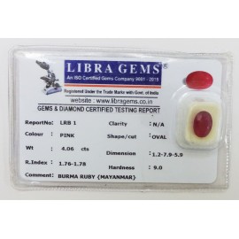 REPORT NO . LRB 1CLARITY . N/ACOLOUR . PINKSHAPE / CUT . OVALWT . 4.06 CTSDIMENSION . 1-2.7-9.5-9.R . INDEX . 1.76-1.78HARDNESS . 9.0COMMENT . BURMA RUBY { MAYANMAR }..