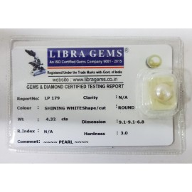 REPORT NO . LP 179CLARITY . N/ACOLOUR . SHINING WHITESHAPE / CUT . ROUNDWT . 4.32 CTSDIMENSION . 9-9.9-9.6-8.R . INDEX . N/AHARDNESS . 3.0COMMENT . PEARL..