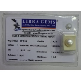 REPORT NO . LP 555CLARITY . N/ACOLOUR . SHINING WHITEWT . 5.10 CTSDIMENSION . 9-5.9-4.6-3.R . INDEX . N/AHARDNESS . 3.0COMMENT . PEARL..