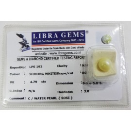 REPORT NO . LPS 192CLARITY . N/ACOLOUR . SHINING WHITESHAPE / CUT . ROUNDWT . 4.79 CTSDIMENSION . 8-5.8-6.8-5.R . INDEX . N/AHARDNESS . 3.0COMMENT . C / WATER PEARL { SOSI }..