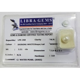 REPORT.NO.-LPS 268CLARITY.-N/ACOLOUR.-SHINING WHITESHAPE/CUT.-ROUNDWT.-3.51 CTSDIMENSION.-7-9.8-1.8-1.R.INDEX.-N/AHARDNESS.-3.0COMMENT.-C / WATER PEARL { SOSI }..
