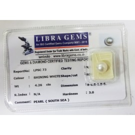 REPORT NO . LPSC 73CLARITY . N/ACOLOUR . SHINING WHITESHAPE / CUT . ROUNDWT . 4.26 CTSDIMENSION . 8-6.8-1.8-6.R . INDEX . N/AHARDNESS . 3.0COMMENT . PEARL { SOUTH SEA }..