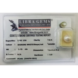 REPORT.NO.LPSC 156CLARITY.N/ACOLOUR.SHINING WHITESHAPE/CUT.ROUNDWT.5.79 CTSDIMENSION.9.4-9.4-9.1R.INDEX.N/AHARDNESS.3.0COMMENT.PEARL{SOUTH SEA}..