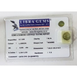 REPORT NO . LC 169CLARITY . N/ACOLOUR . L . GREENSHAPE / CUT . ROUNDWT . 4.90 CTSDIMENSION . 10-5.10-2.6-5.R . INDEX .1.54-1.55HARDNESS . 7.5COMMENT . CATS EYE { S . SQUARTZ }..