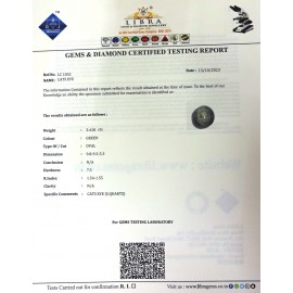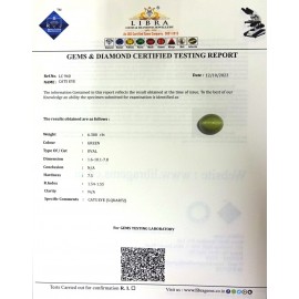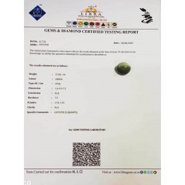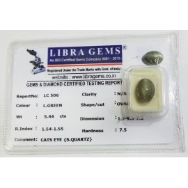REPORT.NO.-LC 506CLARITY.-N/ACOLOUR.-L . GREENSHAPE/CUT.-OVALWT.-5.44 CTSDIMENSION.-1-7.9-3.7-2.R.INDEX.-1.54-1.55HARDNESS.-7.5COMMENT.-CATS EYE { S . QUARTZ }..