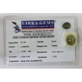 REPORT NO . LC 41CLARITY . N/ACOLOUR . L . GREENSHAPE / CUT . OVALWT . 7.10 CTSDIMENSION . 2-7.1-8.7-1.R . INDEX . 1.54-1.55HARDNESS . 7.5COMMENT . CATS EYE { S . QUARTZ }..
