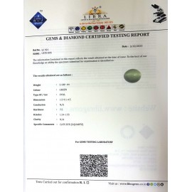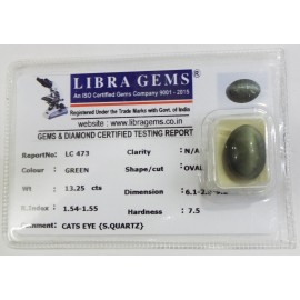 REPORT.NO.-LC 473CLARITY.-N/ACOLOUR.-GREENSHAPE/CUT.-OVALWT.-13.25 CTSDIMENSION.-6-1.2-5.9-2.R.INDEX.-1.54-1.55HARDNESS.-7.5COMMENT.-CATS EYE { S . QUARTZ }..