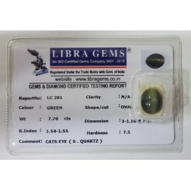 REPORT NO . LC 281CLARITY . N/ACOLOUR . GREENSHAPE / CUT . OVALWT . 7.76 CTSDIMENSION . 3-1.10-8.7-2.R . INDEX . 1.54-1.55HARDNESS . 7.5COMMENT . CATS EYE { S . QUARTZ }..