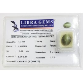 REPORT.NO.-LC 365CLARITY.-N/ACOLOUR.-L . GREENSHAPE/CUT.-OVALWT.-6.82 CTSDIMENSION.-2-1.9-8.8-4.R.INDEX.-1.54-1.55HARDNESS.-7.5COMMENT.-CATS EYE { S . QUARTZ }..