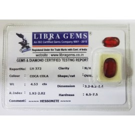 REPORT.NO.-LH 495CLARITY.-N/ACOLOUR.-COCA COLASHAPE/CUT.-OVALWT.-5.45 CTSDIMENSION.-2-8.10-2.4-2.R.INDEX.-1.92-2.02HARDNESS.-6.5-7.5COMMENT.-HESSONITE..