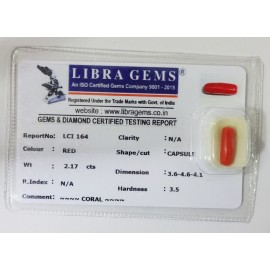 REPORT NO . LCI 164CLARITY . N/ACOLOUR . REDSHAPE / CUT . CAPSULEWT . 2.17 CTSDIMENSION . 3-6.4-6.4-1.R . INDEX . N/AHARDNESS . 3.5COMMENT . CORAL..