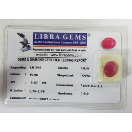 REPORT.NO.-LR 296CLARITY.-N/ACOLOUR.-PINKSHAPE/CUT.-OVALWT.-5.67 CTSDIMENSION.-10.9-8.9-5.7R.INDEX.-1.76-1.78HARDNESS.-9.0COMMENT.-RUBY..