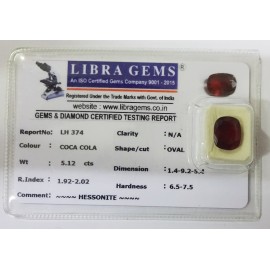 REPORT.NO.-LH 374CLARITY.-N/ACOLOUR.-COCA COLASHAPE/CUT.-OVALWT.-5.12 CTSDIMENSION.-1-4.9-2.5-4.R.INDEX.-1.92-2.02HARDNESS.-6.5-7.5COMMENT.-HESSONITE..