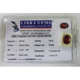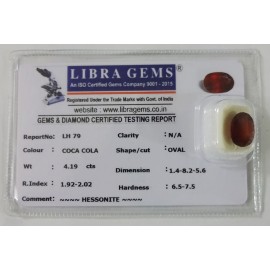 REPORT NO . LH 79CLARITY . N/ACOLOUR . COCA COLASHAPE / CUT . OVALWT . 4.19 CTSDIMENSION . 1-4.8-2.5-6.R . INDEX . 1.92-2.02HARDNESS . 6.5-7.5COMMENT . HESSONITE..