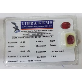 REPORT NO . LR 18CLARITY . N/ACOLOUR . PINKSHAPE / CUT . OVALWT . 4.40 CTSDIMENSION . 10-8.8-6.4-7.R . INDEX . 1.76-1.78HARDNESS . 9.0COMMENT . RUBY..
