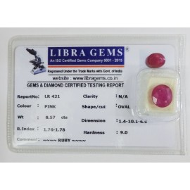 REPORT.NO.-LR 421CLARITY.-N/ACOLOUR.-PINKSHAPE/CUT.-OVALWT.-8.57 CTSDIMENSION.-1-4.10-1.6-9.R.INDEX.-1.76-1.78HARDNESS.-9.0COMMENT.-RUBY..
