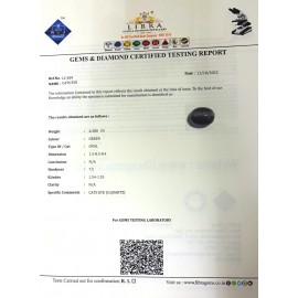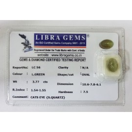 REPORT NO . LC 56CLARITY . N/ACOLOUR . L . GREENSHAPE / CUT . OVALWT . 3.77 CTSDIMENSION . 10-6.7-8.6-1.R . INDEX . 1.54-1.55HARDNESS . 7.5COMMENT . CATS EYE { S . QUARTZ }..