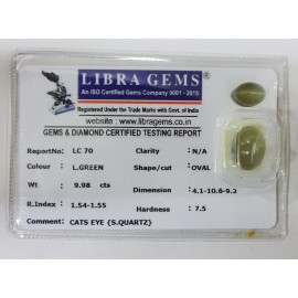 REPORT NO . LC 70CLARITY . N/ACOLOUR . L . GREENSHAPE / CUT . OVALWT . 9.98 CTSDIMENSION . 4-1.10-6.9-2.R . INDEX . 1.54-1.55HARDNESS . 7.5COMMENT . CATS EYE { S . QUARTZ }..
