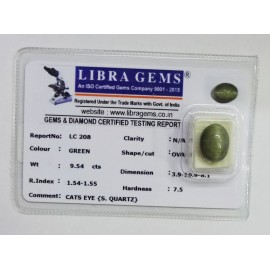 REPORT NO . LC 208CLARITY . N/ACOLOUR . GREENSHAPE / CUT . OVALWT . 9.54 CTSDIMENSION . 3-9.10-9.8-1.R . INDEX . 1.54-1.55HARDNESS . 7.5COMMENT . CATS EYE { S . QUARTZ }..