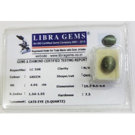 REPORT.NO.-LC 508CLARITY.-N/ACOLOUR.-GREENSHAPE/CUT.-OVALWT.-4.96 CTSDIMENSION.-10-7.9-5.6-8.R.INDEX.-1.54-1.55HARDNESS.-7.5COMMENT.-CATS EYE { S . QUARTZ ]..