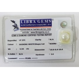 REPORT NO . LP 231CLARITY . N/ACOLOUR . SHINING WHITESHAPE / CUT . ROUNDWT . 5.56 CTSDIMENSION . 10-6.6-4.10-6.R . INDEX . N/AHARDNESS . 3.0COMMENT . PEARL..