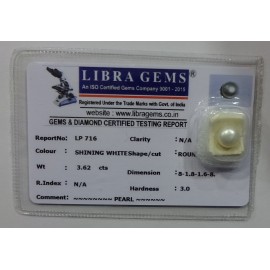 REPORT NO . LP 716CLARITY . N/ACOLOUR . SHINING WHITESHAPE / CUT . ROUNDWT . 3.62 CTSDIMENSION . 8-1.8-1.6-8.R . INDEX . N/AHARDNESS . 3.0COMMENT . PEARL..