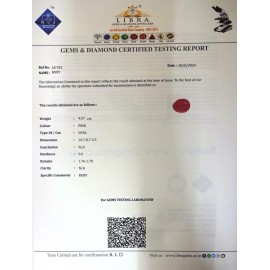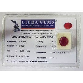 REPORT.NO.-LRA 98CLARITY.-N/ACOLOUR.-PINKSHAPE/CUT.-OVALWT.-4.25 CTSDIMENSION.-9-7.8-3.5-6.R.INDEX.-1.76-1.78HARDNESS.-9.0COMMENT.-RUBY { A }..