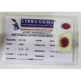 REPORT NO . LR 238CLARITY . N/ACOLOUR . PINKSHAPE / CUT . OVALWT . 6.34 CTSDIMENSION . 1-3.9-2.6-1.R . INDEX . 1.76-1.78HARDNESS . 9.0COMMENT . RUBY..