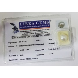 REPORT NO . LP 1078CLARITY . N/ACOLOUR . SHINING WHITESHAPE / CUT . ROUNDWT . 4.80 CTSDIMENSION . 9-8.9-3.6-7.R . INDEX . N/AHARDNESS . 3.0COMMENT . PEARL..