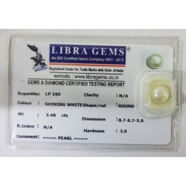 REPORT NO . LP 169CLARITY . N/ACOLOUR . SHINING WHITESHAPE / CUT . ROUNDWT . 3.48 CTSDIMENSION . 8-7.8-7.5-8.R . INDEX . N/AHARDNESS . 3.0COMMENT . PEARL..