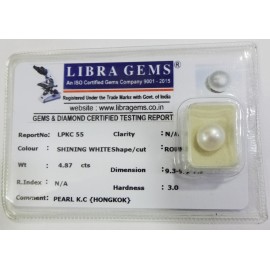 REPORT.NO.-LPKC 55CLARITY.-N/ACOLOUR.-SHINING WHITESHAPE/CUT.-ROUNDWT.-4.87 CTSDIMENSION.-9-3.9-1.7-9.R.INDEX.-N/AHARDNESS.-3.0COMMENT.-PEARL K.C { HONGKOK }..