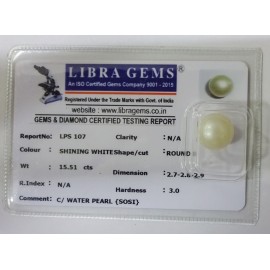 REPORT NO . LPS 107CLARITY . N/ACOLOUR . SHINING WHITESHAPE / CUT . ROUNDWT . 15.51 CTSDIMENSION . 2-7.2-8.2-9.R . INDEX . N/AHARDNESS . 3.0COMMENT . C / WATER PEARL { SOSI }..