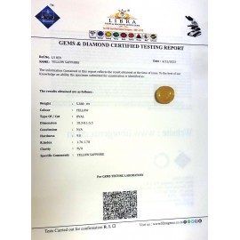 REPORT NO . LY 179CLARITY . N/ACOLOUR . YELLOWSHAPE / CUT . OVALWT . 3.37 CTSDIMENSION . 8-2.10-2.4-1.R . INDEX . 1.76-1.78HARDNESS . 9.0COMMENT . YELLOW SAPPHIRE..
