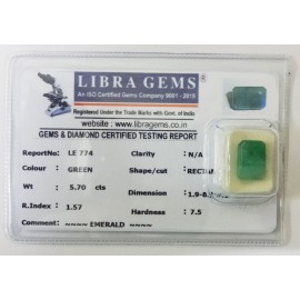 REPORT.NO.LE 774CLARITY.N/ACOLOUR.GREENSHAPE/CUT.RECTANGLEWT.5.70 CTSDIMENSION.1.9-8.1-7.1R.INDEX.1.57HARDNESS.7.5COMMENT.EMERALD ..