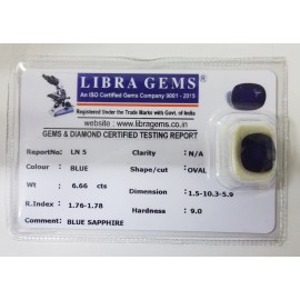 REPORT.NO.LN 587CLARITY.N/ACOLOUR.BLUESHAPE/CUT.OVALWT.6.10 CTSDIMENSION.10.5-9.1-6.6R.INDEX.1.76-1.78HARDNESS.9.0COMMENT.BLUE SAPPHIRE..