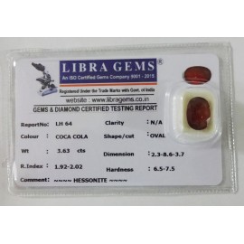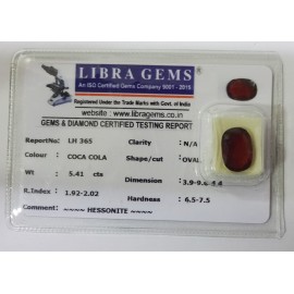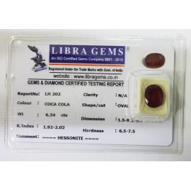 REPORT.NO.-LH 279CLARITY.-N/ACOLOUR.-COCA COLASHAPE/CUT.-OVALWT.-8.02 CTSDIMENSION.-2-3.10-1.7-3.R.INDEX.-1.92-2.02HARDNESS.-6.5-7.5COMMENT.-HESSONITE..