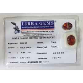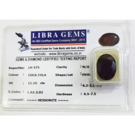 REPORT.NO.LH  566CLARITY.N/A COLOUR.COCA COLA SHAPE/CUT.OVAL WT.10.30 CTS DIMENSION. 6.3-3.3-5.2R.INDEX. 1.92-2.02HARDNESS.6.5-7.5 COMMENT.HESSONITE..