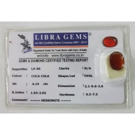 REPORT.NO.LHS 211CLARITY.N/ACOLOUR.COCA COLASHAPE/CUT.OVALWT.4.74 CTSDIMENSION.2.6-8.9-4.5R.INDEX.1.92-2.02HARDNESS.6.5-7.5COMMENT.HESSONITE {S}..