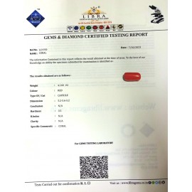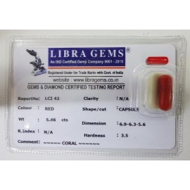 REPORT NO . LCI 42CLARITY. N/ACOLOUR. REDSHAPE/CUT. CAPSULEWT. 5.46 CTSDIMENSION. 6.9-6.3-5.6R. INDEX. N/AHARDNEESS. 3.5COMMENT. CORAL..
