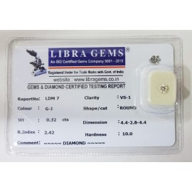 REPORT NO . LDM 7CLARITY . VS-1COLOUR . G-J SHAPE / CUT . ROUNDWT . 0.32 CTSDIMENSION . 4-4.2-8.4-4.R . INDEX . 2.42HARDNESS . 10.0COMMENT . DIAMOND..