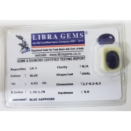 REPORT NO . LN 3CLARITY . N/ACOLOUR . BLUESHAPE / CUT . OVALWT . 6.92 CTSDIMENSION . 2-7.9-2.6-3.R . INDEX . 1.76-1.78HARDNESS . 9.0COMMENT . BLUE SAPPHIRE..